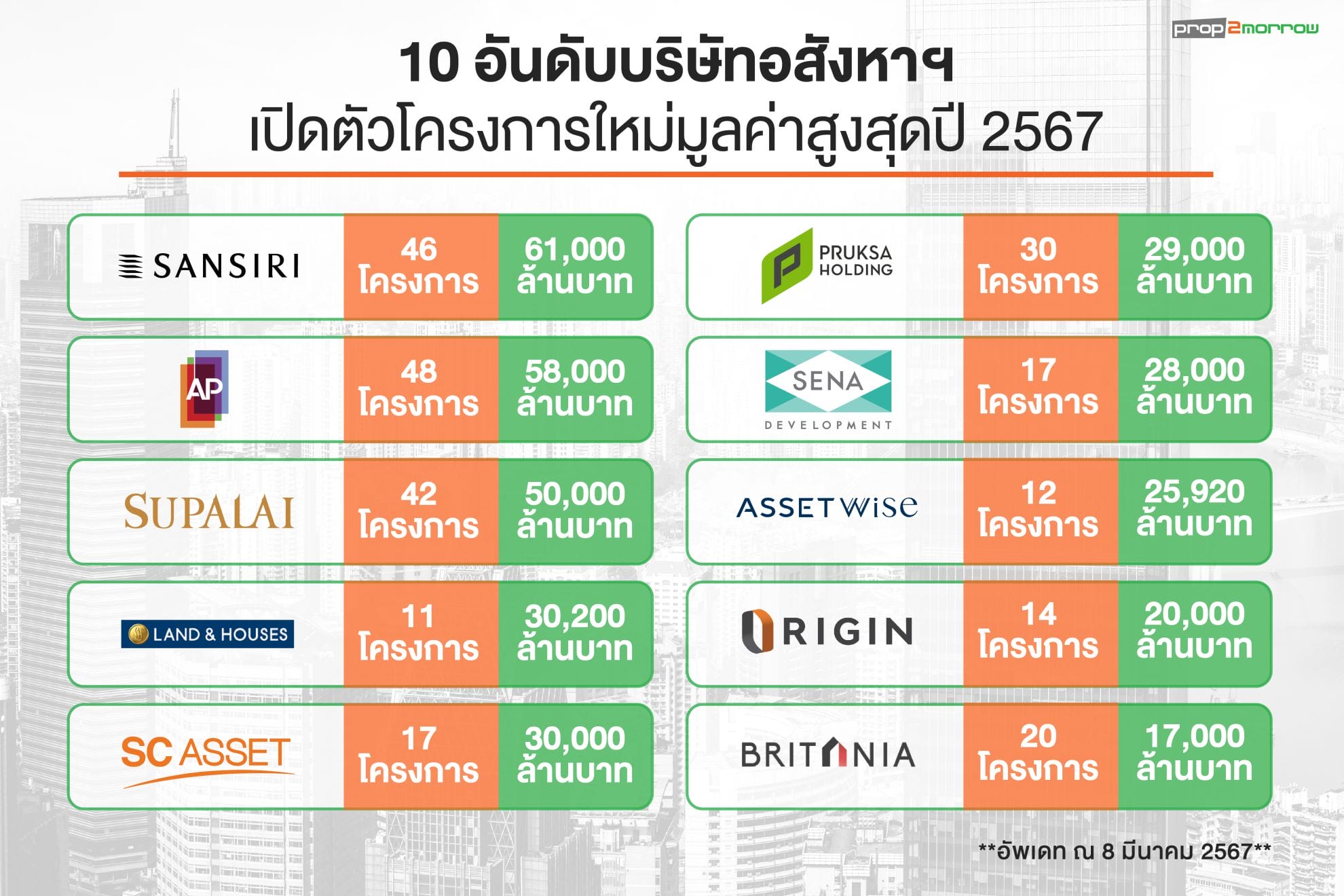10 บริษัทอสังหาฯที่มีการเปิดโครงการใหม่มูลค่าสูงสุด ปี 2567