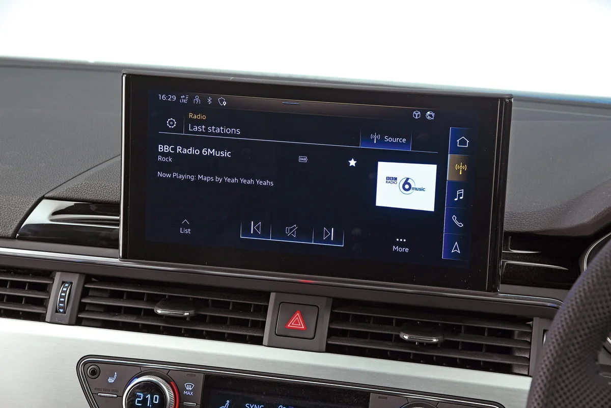 เราไม่เชื่อว่าระบบที่ได้รับการอัพเดตของ A4 นั้นเหนือกว่า หน้าจอ 10.1 นิ้ว ใหญ่กว่ารุ่นก่อนหน้า กราฟิกคมชัด แต่ตัวควบคุมแบบหมุนแบบเก่าดูขัดกันชอบกล ระบบสามารถใช้งานได้อย่างสมบูรณ์ผ่านหน้าจอสัมผัส มันทำให้เสียสมาธิมากขณะขับ ขอบบนซ้ายของจอเป็นที่ว่างเฉยๆ มันอาจตอบสนองช้าบ้างแต่อย่างน้อยคุณจะได้รับระบบเชื่อมต่อสมาร์ทโฟน Apple CarPlay และ Android Auto