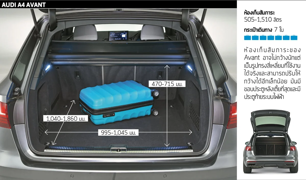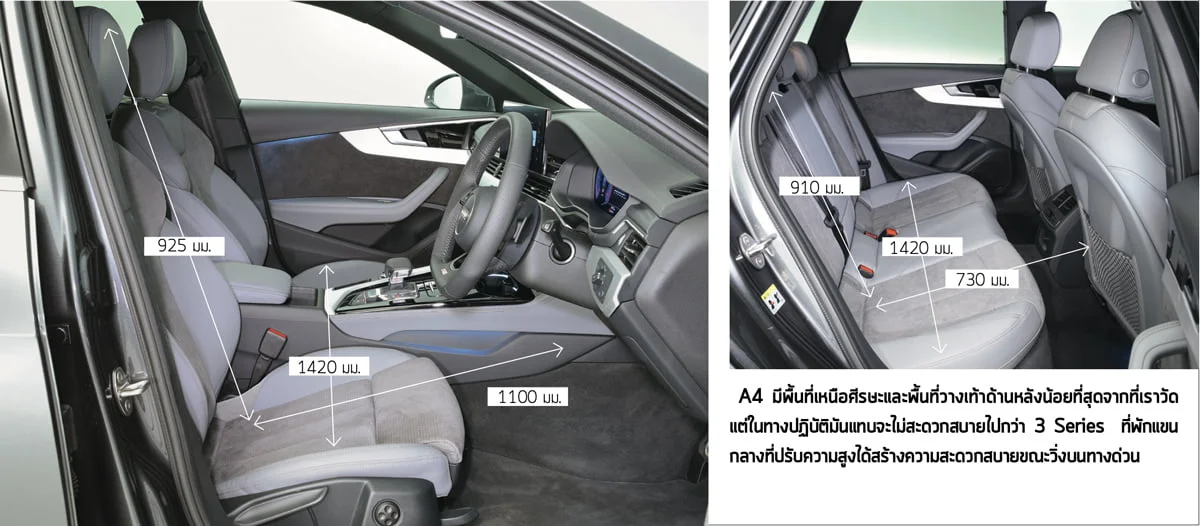 ในขณะเดียวกัน หลังคาพาโนรามาที่เป็นออปชั่นเสริมใน 3 Series จะกินพื้นที่เหนือศีรษะหากคุณขยับหัวออกจากพนักพิง สำหรับ A4 นั้นมีพื้นที่น้อยกว่า 3 Series เล็กน้อยแต่มีข้อจำกัดน้อยกว่าสำหรับพื้นที่เหนือศีรษะเมื่อไม่ติดตั้งหลังคาพาโนรามิก