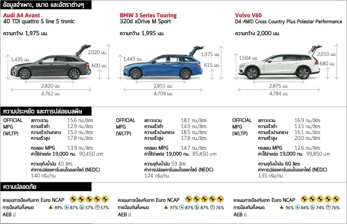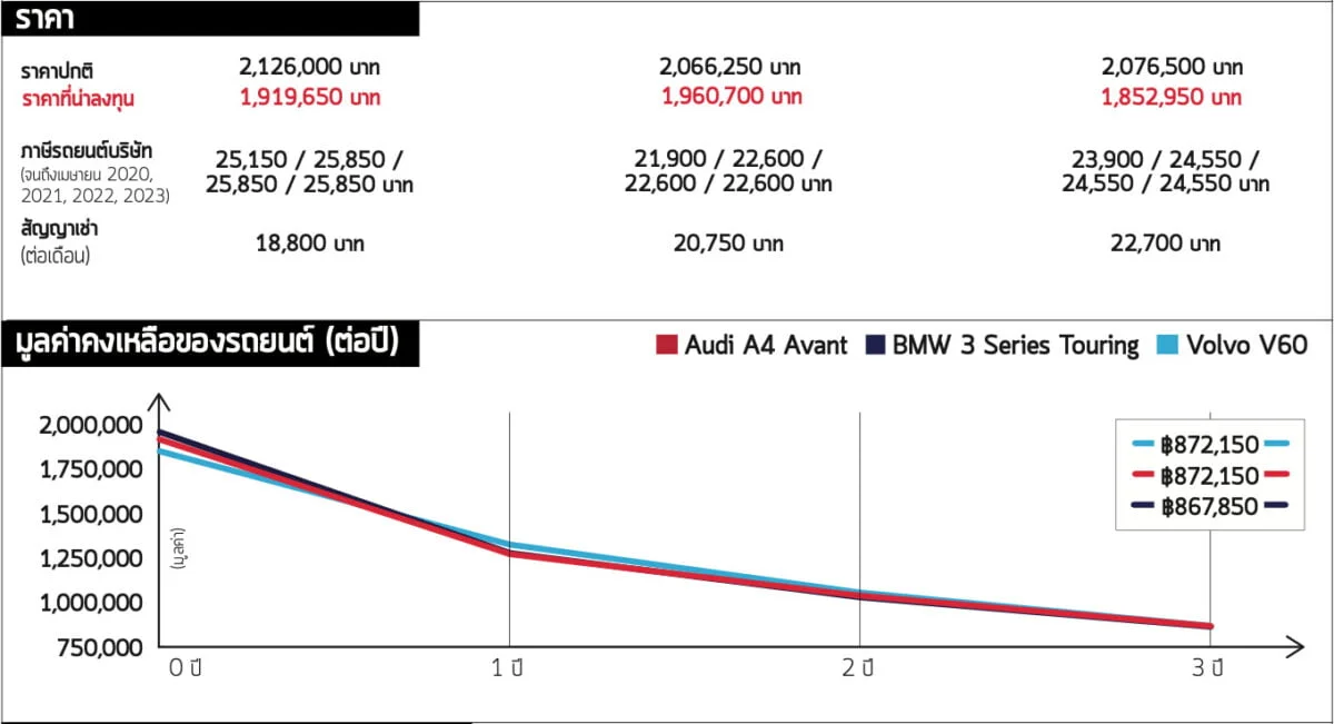 3 Series และ V60 มีมูลค่าพอๆ กันตลอดระยะเวลา 3 ปี ขณะที่ A4 เสื่อมมูลค่าเร็วกว่าเล็กน้อย อย่างไรก็ตาม V60 จะทำให้ผู้ซื้อรถส่วนตัวเสียค่าใช้จ่ายน้อยที่สุดเนื่องจากส่วนลดจำนวนมาก 3 Series จะมีราคาสูงที่สุดแต่ก็ประหยัดเชื้อเพลิงที่สุด มันทำได้ 14.7 กม./ลิตร ในการทดสอบความประหยัดของเรา เทียบกับ 13.9 กม./ลิตร ของ A4 และ 12.6 กม./ลิตร ของ V60