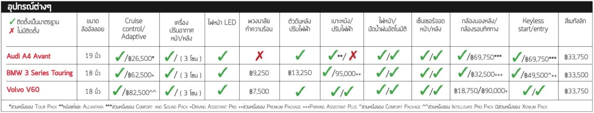 V60 มีอุปกรณ์ที่เหมาะสมกับเงินของคุณที่สุด มันเป็นคันเดียวที่มีระบบเปิดประตูโดยไม่ใช้กุญแจ, ระบบเปิดประตูท้ายโดยไม่ต้องใช้มือ และระบบควบคุมความเร็วรถขณะลงทางลาดชัน แต่ A4 และ 3 Series มีระบบปรับอากาศแบบ 3 โซนมาให้