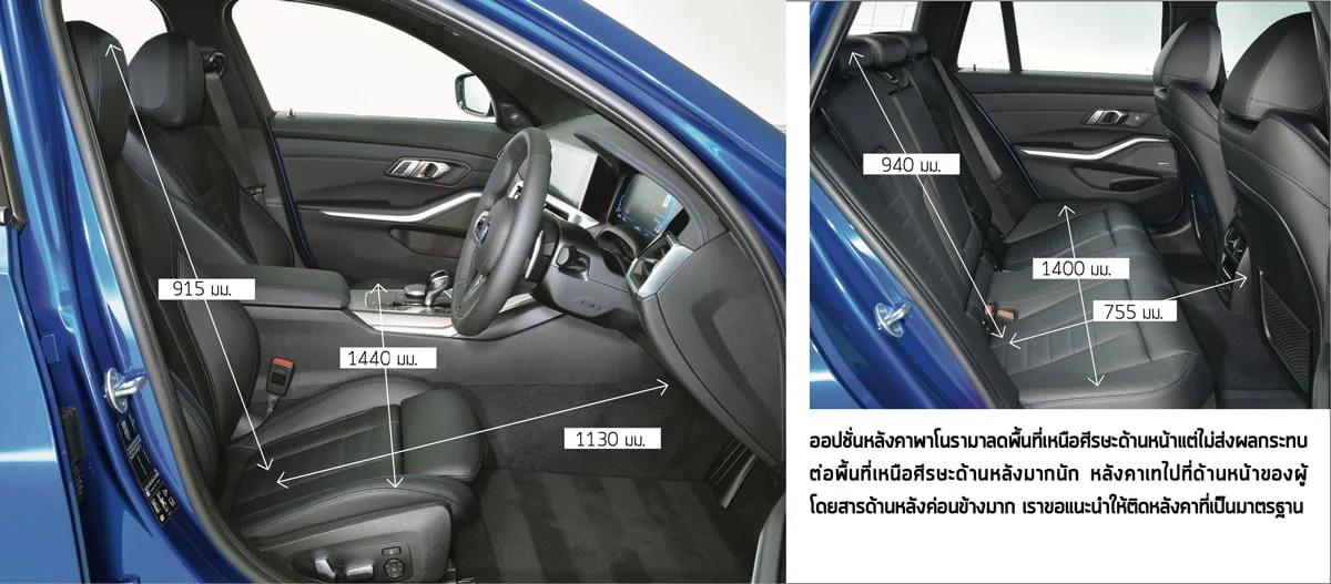 3 Series ชดเชยข้อด้อยด้วยตำแหน่งการขับที่ยอดเยี่ยม เมื่อติดตั้ง Premium Package จะเพิ่มตัวดันหลังปรับไฟฟ้าที่เบาะนั่งคู่หน้า และเบาะปรับไฟฟ้าพร้อมฟังก์ชั่นจดจำตำแหน่งที่ฝั่งคนขับ คนขับที่ตัวสูงและเตี้ยจะถูกรองรับเป็นอย่างดี ที่นั่งยังรองรับการเข้าโค้งหักศอกได้ดีเท่าการวิ่งระยะไกลบนทางด่วน
