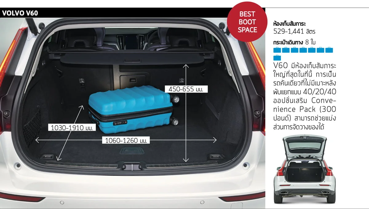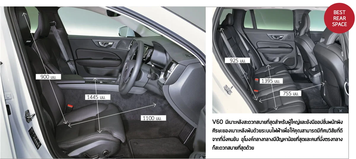 V60 ยังมีที่เบาะหลังตัวกลางที่สบายที่สุดพร้อมอุโมงค์เพลากลางเตี้ยที่สุด ไม่มีรถคันไหนเลยที่อัดผู้ใหญ่ 3 คนไว้เบาะหลังได้โดยที่พวกเขาไม่บ่น